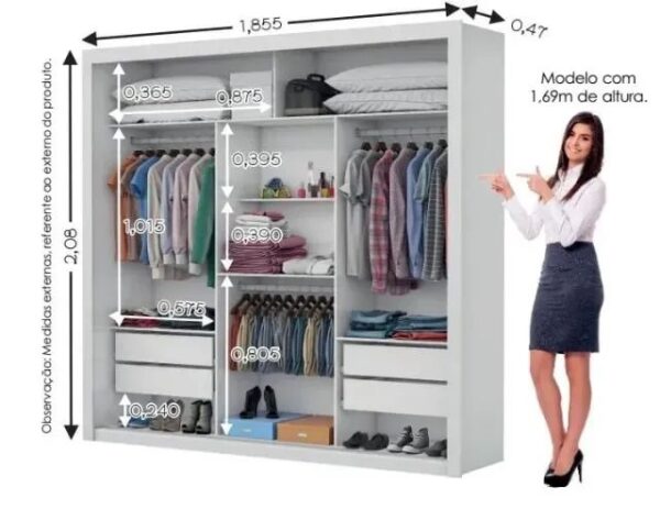O Guarda-Roupa Clara com 3 portas de correr, combinado com 4 gavetas, 4 prateleiras e 3 cabideiros, deixa o produto com uma divisão funcional capaz de proporcionar ao cliente acomodar todas as suas roupas de maneira mais organizada e com maior visibilidade.